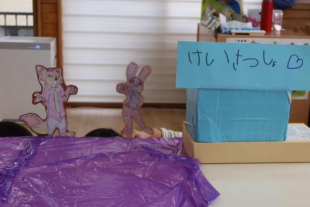 「映画をやりたい!」と子どもたちで警察署を作ったりズートピアのキャラクターを作ったりして映画館が開演しました!