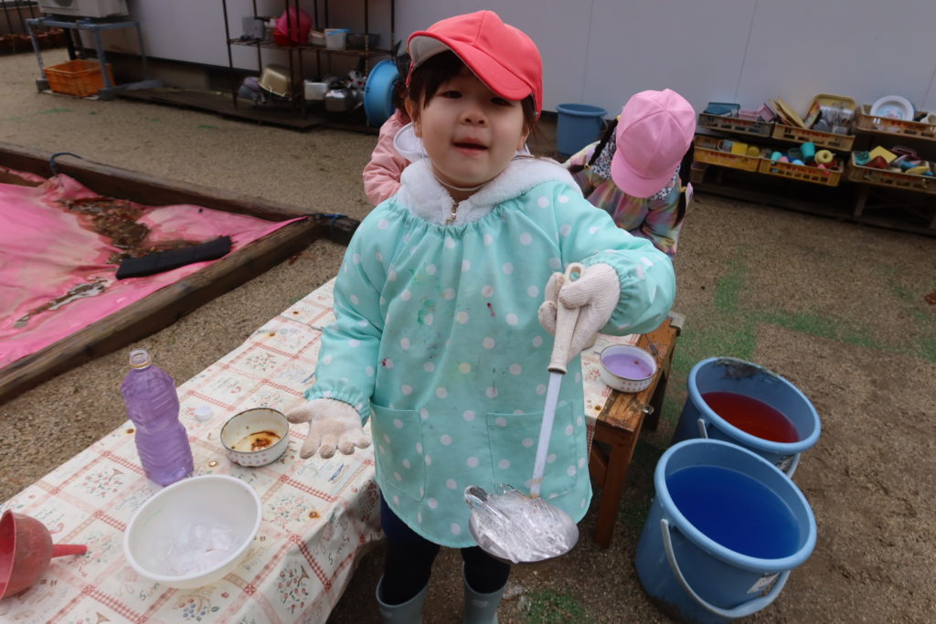 戸外では氷ができていることに喜ぶ子どもたち!
