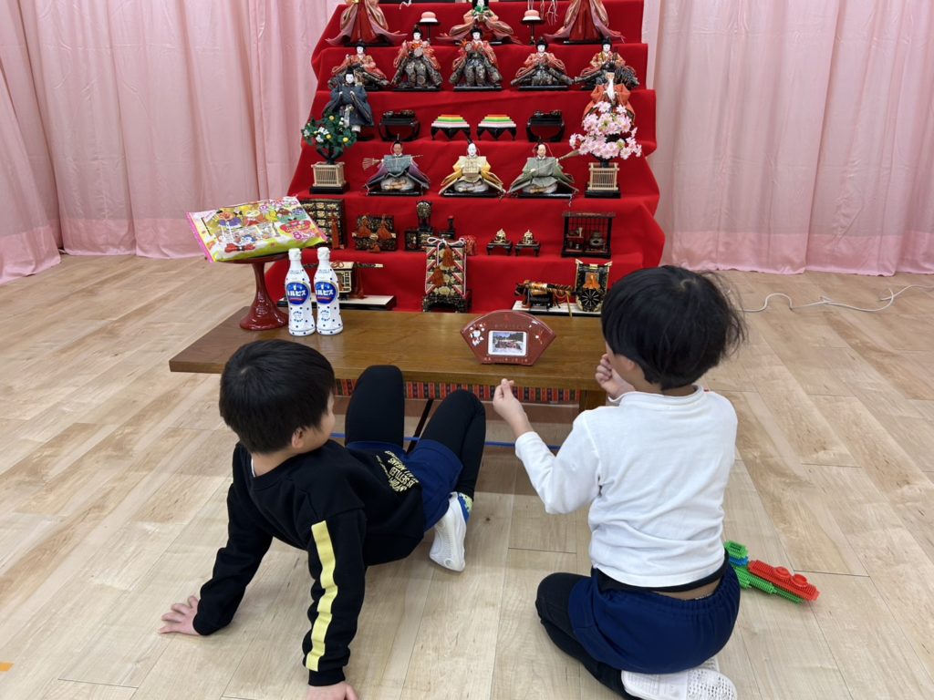 昨日からステージにひな人形が飾られ、興味津々に見る子どもたち!