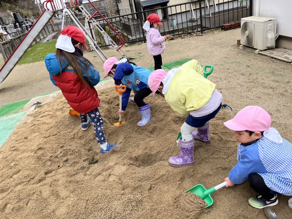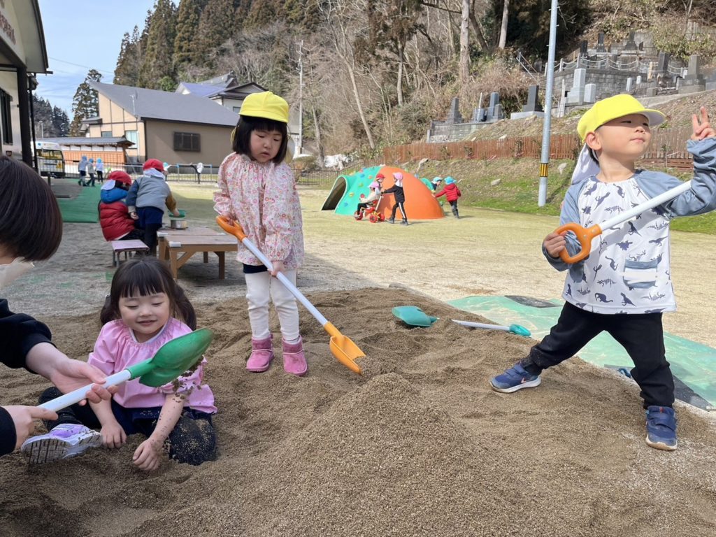 冬の間、お休みしていた砂場が遊べるようになり、穴を掘ったり、山を作ったりして楽しみましたよ😁