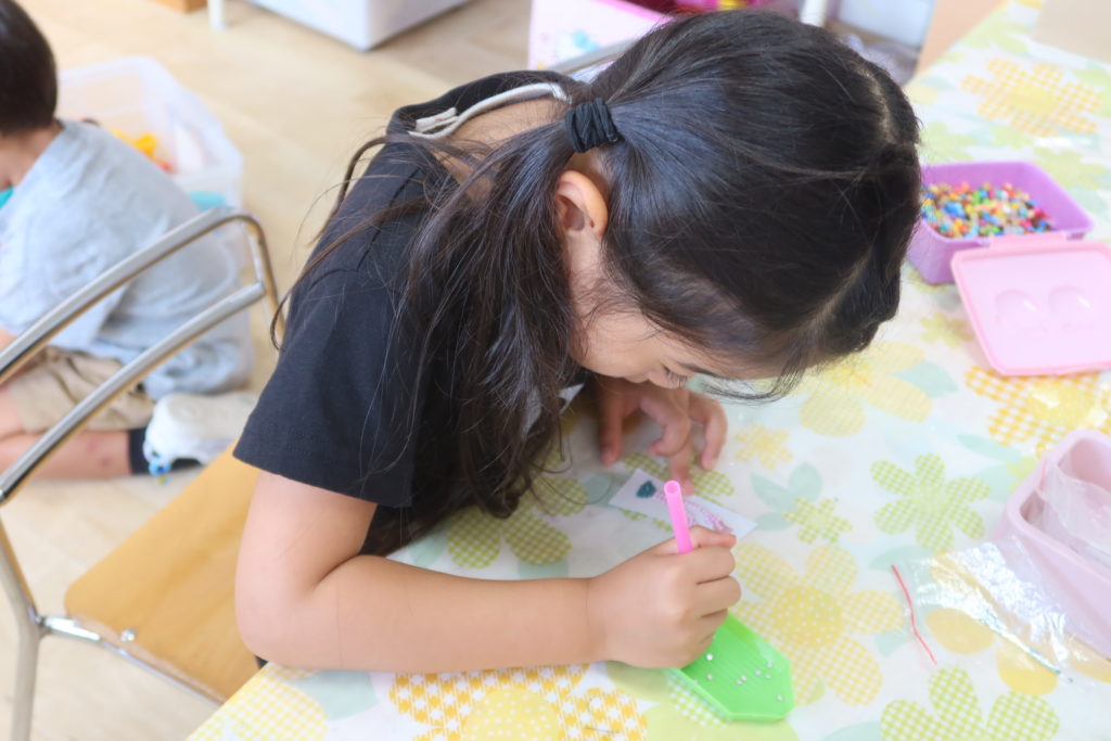 お部屋でも好きな遊びをして楽しむ子どもたちで、ビーズアートシールを集中して取り組む姿も見られましたよ!