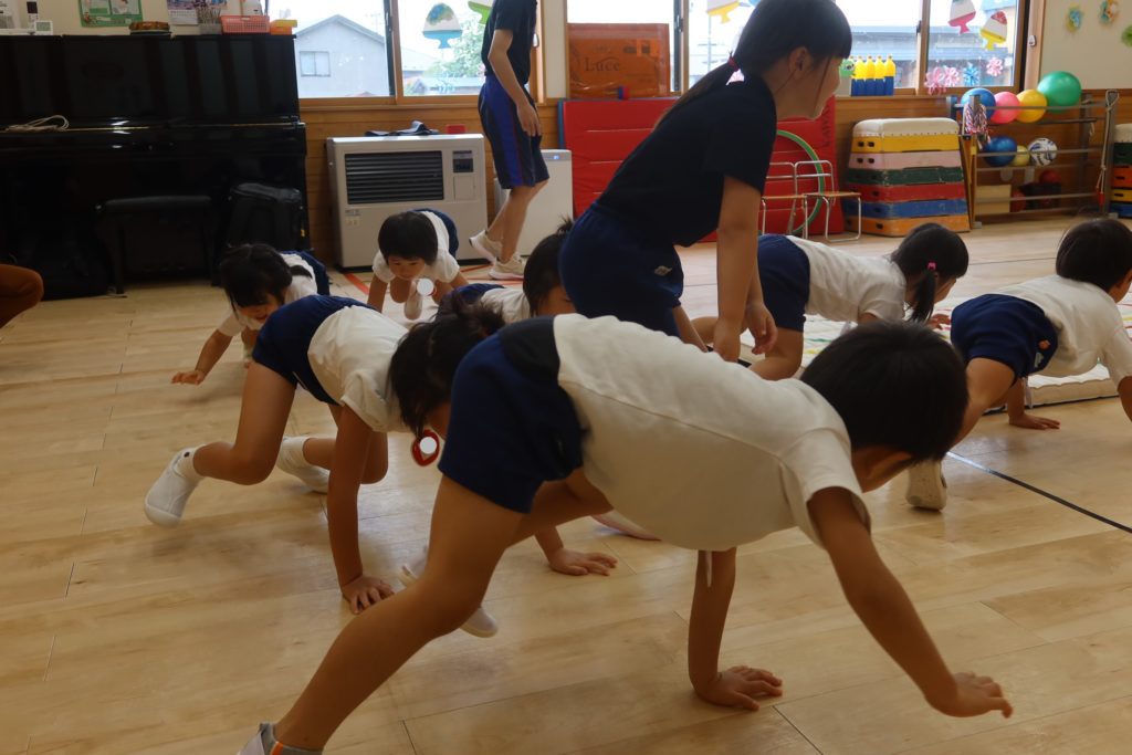 年中・年少さんは準備運動でかけっこや前転の練習を頑張りました💮