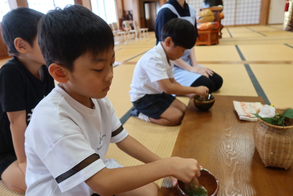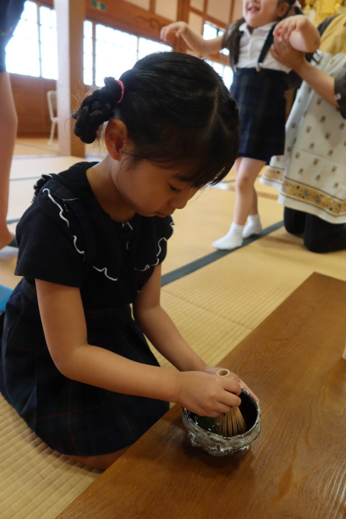 年長児さんは初めておもてなしをする側となり、ちょぴり緊張しているようでしたが、先生のお話を聞いて、実際にお茶をたてたり、お運びをしたりと頑張っていましたよ😊✨